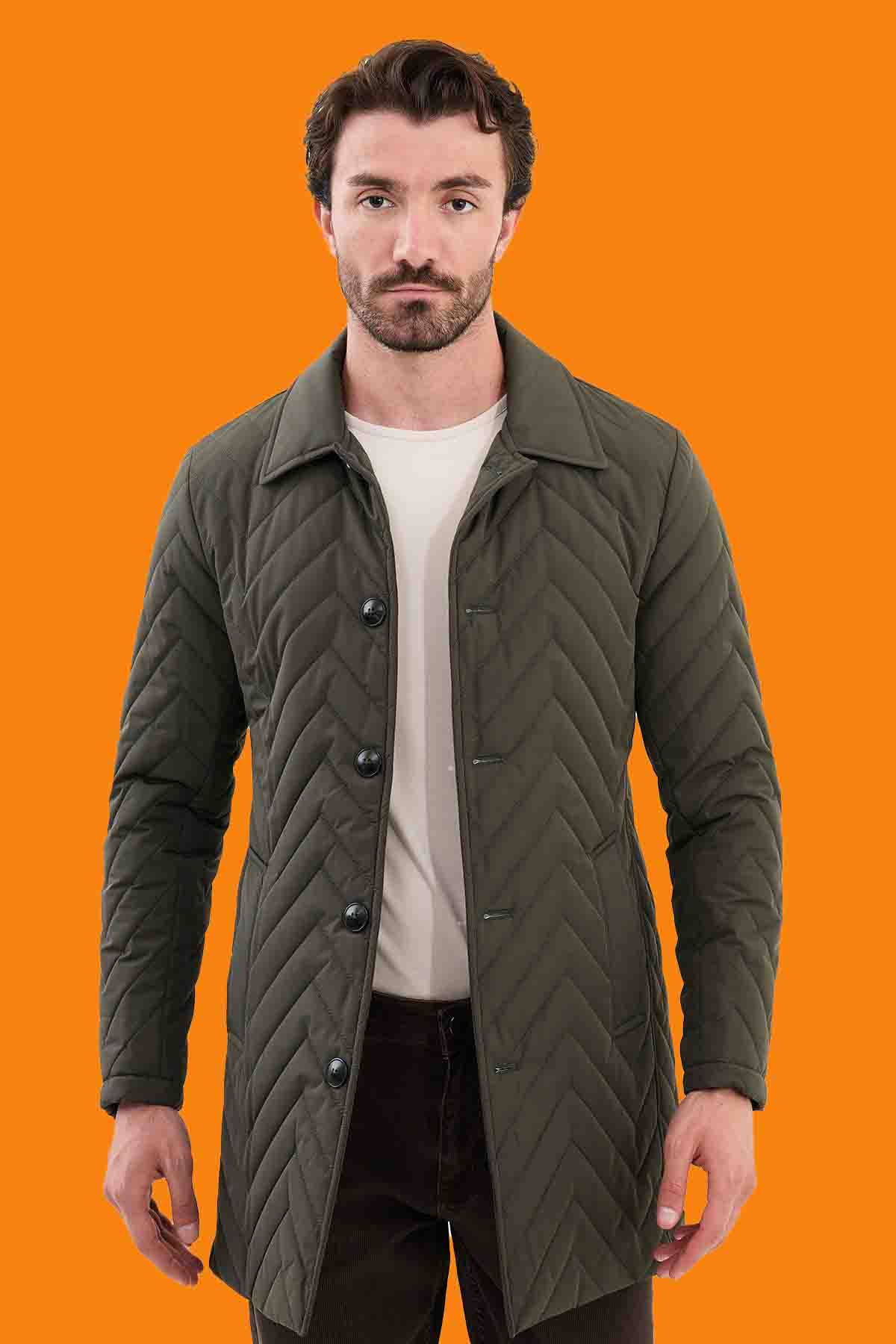 Men's Olive Green Slim Quilted Car Coat - Chevron