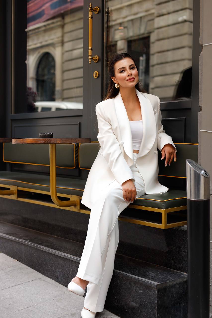 Featuring a double-breasted blazer with lustrous satin lapels and coordinating tailored trousers, this off-white set is a masterpiece of minimalist sophistication. Its clean lines, covered button details, and crisp tailoring make it a versatile icon of power dressing.