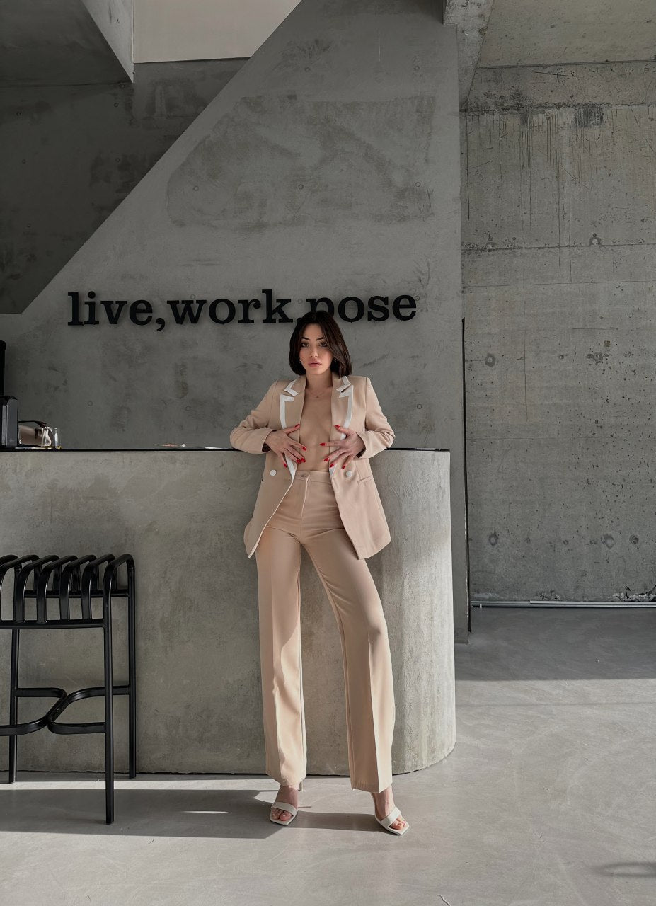 The combination of beige fabric with sharp white lapels and cuffs creates a fresh, modern contrast that feels both chic and versatile.