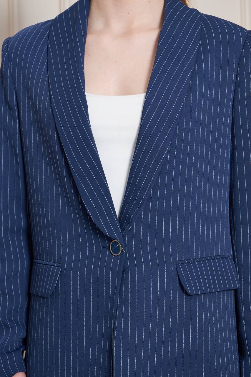 Tailored from premium striped crepe fabric, this suit offers a structured fit that flatters while providing day-long comfort. The shawl collar adds an air of refined sophistication, while the deep navy hue reflects confidence, professionalism, and lasting style.