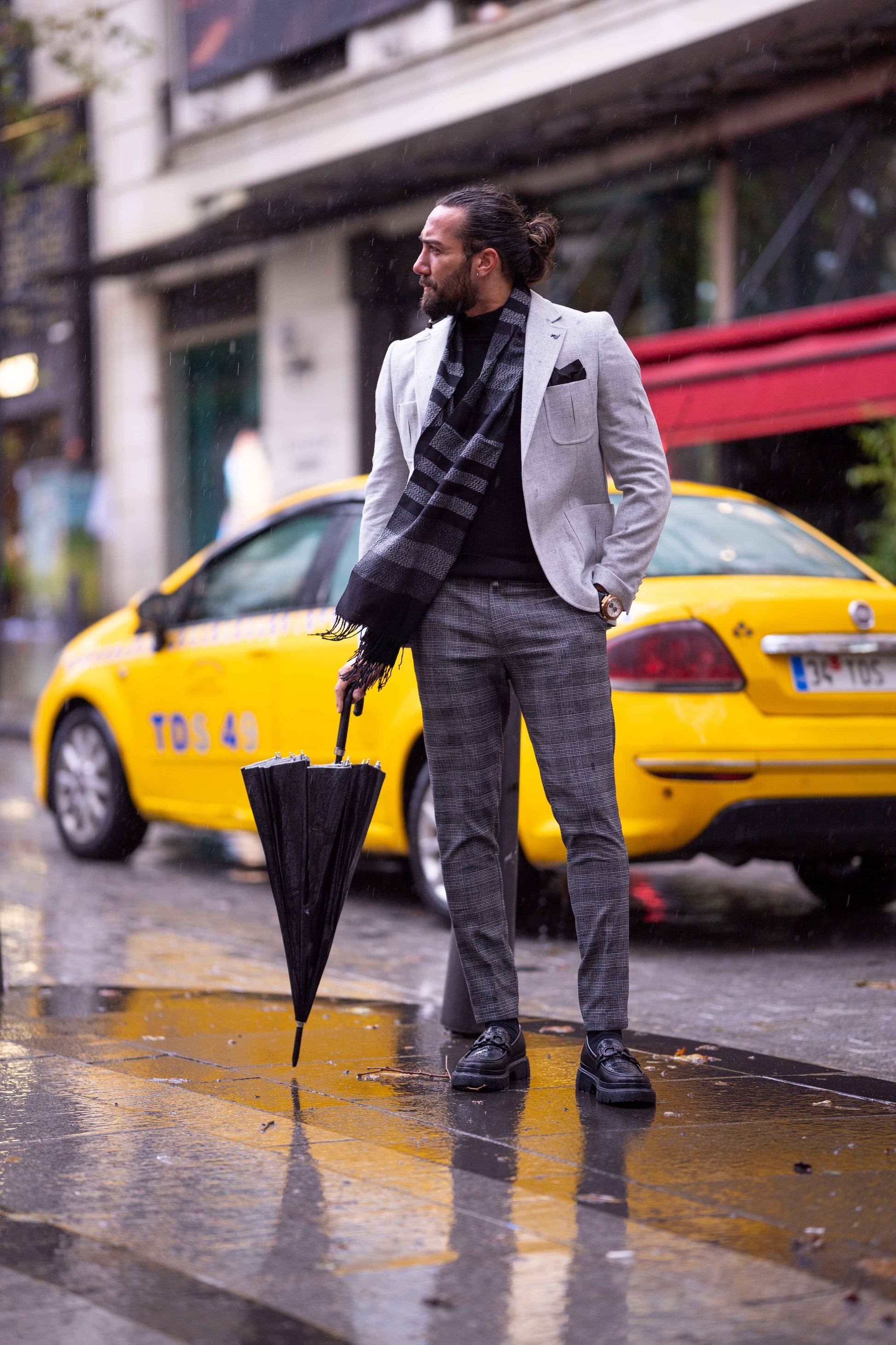 This impeccably tailored light grey blazer offers a refined silhouette, perfect for navigating city streets on drizzly days or adding a touch of smart casual elegance to any ensemble. Crafted with a keen eye for detail, it pairs effortlessly with a dark turtleneck and patterned trousers, as shown, for a look that's both polished and practical.