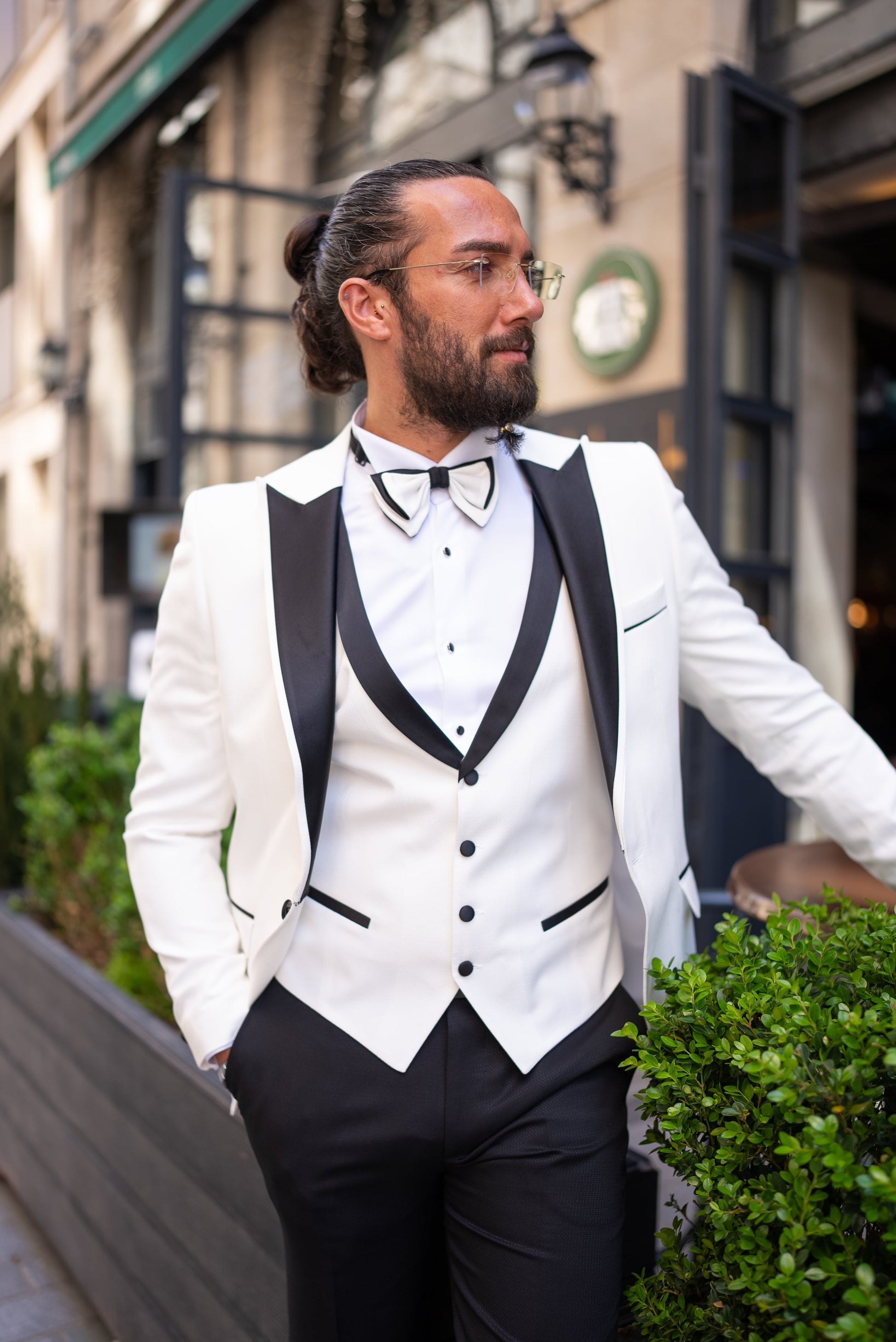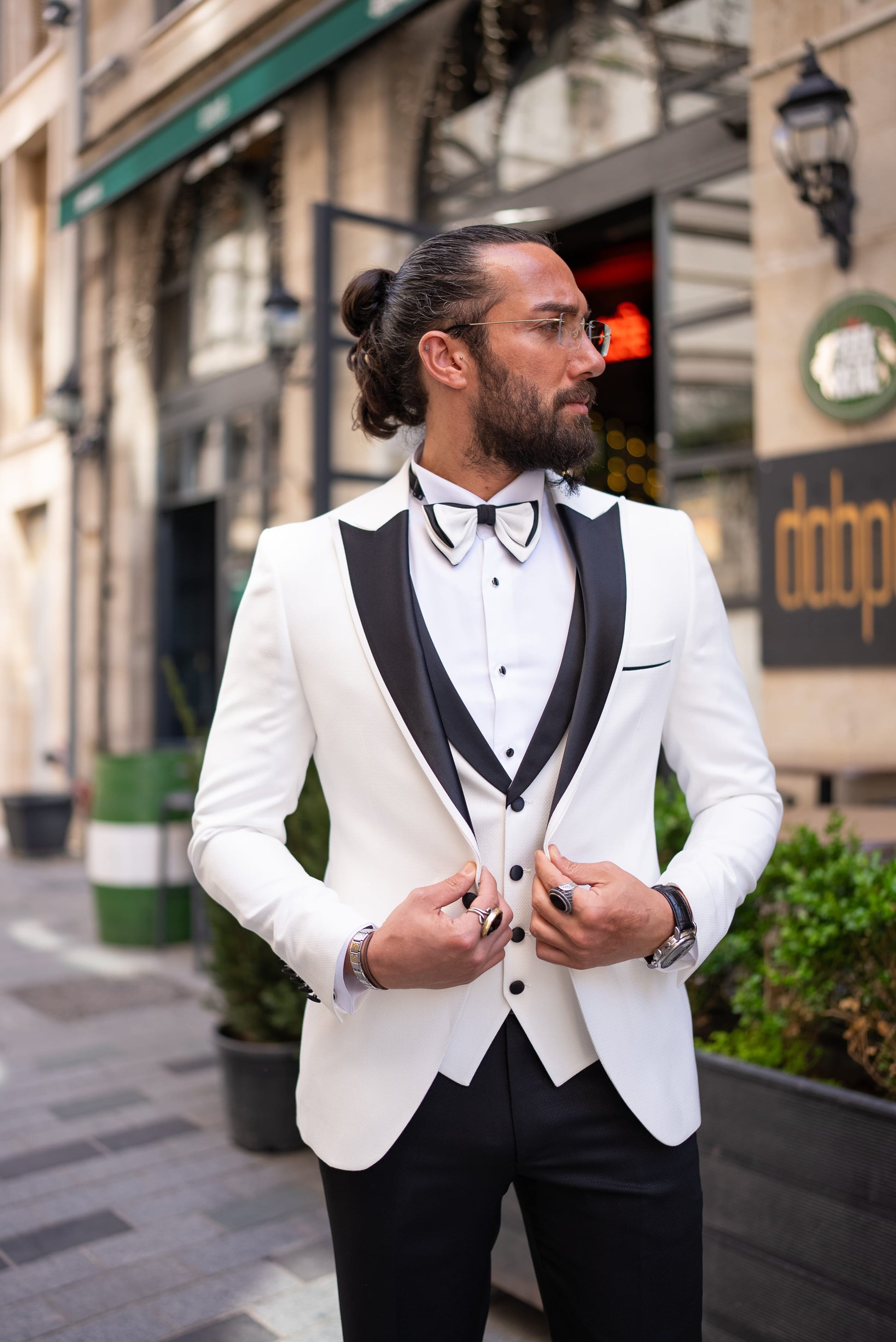 Redefine classic elegance with the White Valor Tuxedo Ensemble — a standout selection designed for the gentleman who dares to wear white with confidence. Featuring a crisp silhouette enhanced by a structured double-button closure, pointed collar, flap pockets, and a fully lined interior, this look brings prestige to every entrance.